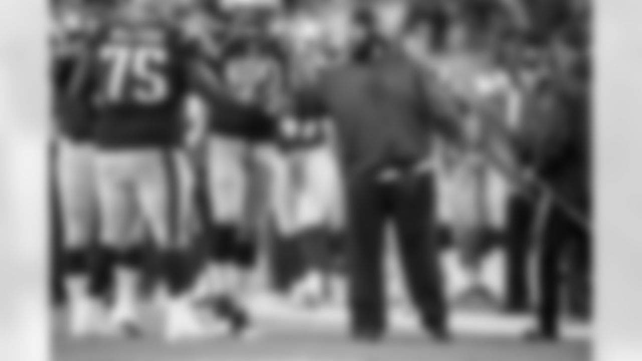 New England Patriots defensive coordinator Matt Patricia congratulates defensive tackle Vince Wilfork (75) during the 2014 NFL week 5 football game against the Cincinnati Bengals on Sunday, Oct 05, 2014 in Foxboro, MA. The Patriots won the game 43-17. (AP Photo / Jim Mahoney)